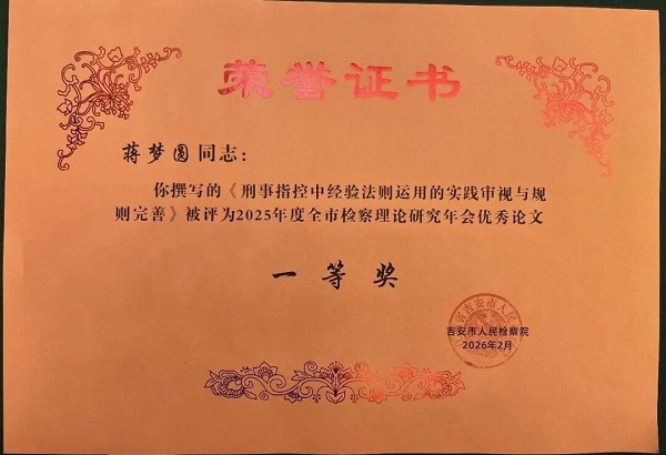 2月3日,吉安市人民检察院召开全市检察理论研究年会,吉州区检察院干警蒋梦圆撰写的理论文章《刑事指控中经验法则运用的实践审视与规则完善》荣获优秀调研成果一等奖。