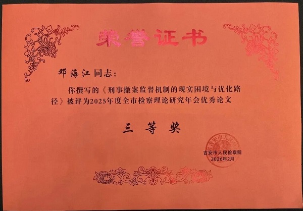 邓海江撰写的理论文章《刑事撤案监督机制的现实困境与优化路径》荣获优秀调研成果三等奖。